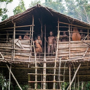 Papua's Korowai tribe is a tribe that was only found around 35 years ago in the interior of Papua. Population of around 3000 people. This isolated tribe lives in a tree house called Rumah Tinggi. Some houses can even reach a height of 50 meters above the ground. The Papuan Korowai are one of the mainland Papuans who do not use koteka.